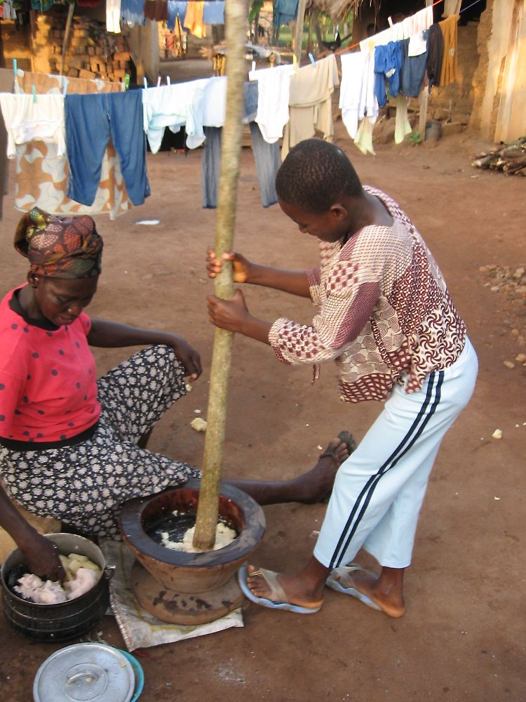 Der Herstellungsprozess des in ganz Westafrika am meisten verbreiteten Grundnahrungsmittels ist ziemlich langwierig: Die weichgekochten Gemüsestücke werden mit einem zwei Meter langen Fufustab in einem großen Holzmörser so lange zerstoßen, bis eine glatte, stücklose Masse entstanden ist. Normalerweise sind beim Stampfen zwei Personen beteiligt: Eine Frau steht neben dem Mörser und stampft mit dem Holzstab den Brei. Eine zweite Frau sitzt gegenüber und wendet immer wieder den Fufu-Ball und drückt ihn in die Mitte der Schüssel zurück, passgenau unter den Stab. Und das exakt zwischen den rhythmischen Schlägen der Stampferin, wenn die gerade den Fufu-Stab nach oben zieht. Aus dem Rhythmus sollte dabei keine der Beteiligten kommen ... Der sattmachende Brei wird kombiniert mit scharfen Soßen und Eintöpfen. Auch Hühnchen oder Ziegenfleisch wird dazu gereicht, an der Küste meistens Fisch. Beim Essen wird mit der rechten Hand (und zwar nur mit der rechten, die linke gilt als unrein) von dem dicken Fufuball ein Stück abgerissen, in die scharfe Soße oder Suppe getunkt und dann gefuttert. Das ist für Ungeübte nicht ganz einfach, besonders wenn alles noch sehr heiß ist. Finger ablecken ist üblich und auch notwendig. Da in Ghana traditionell mit den Fingern gegessen wird, stehen auf den Tischen Wasserschüsseln und Spülmittel immer bereit. Auch in den Restaurants werden Seife und Wasser mitserviert.