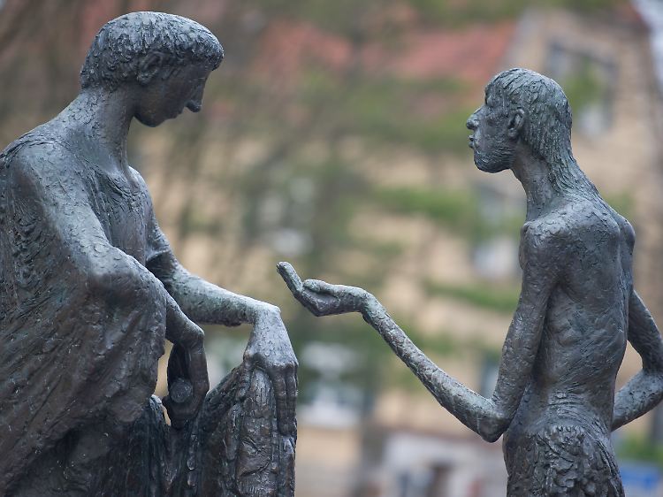 Vor der Martinskirche in Sindelfingen stehen der Heilige und ein Bettler.