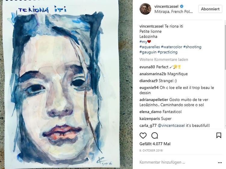 Seine 19-jährige Freundin Tina Kunakey, mit der er seit der Trennung von Monica Bellucci zusammen ist, gemalt von Vincent Cassel.