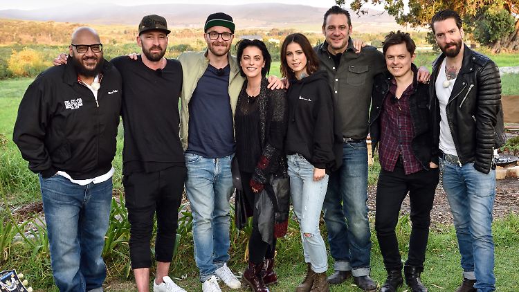 Gemeinsame Gruppentherapie in Südafrika: Moses Pelham, Gentleman, Mark Forster, Stefanie Kloß von Silbermond, Lena Meyer-Landrut, Sascha Vollmer von The BossHoss, Paddy Kelly und Alec Völkel von The BossHoss (v.l.n.r.).