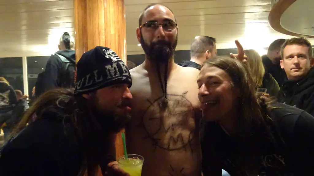 Es wurde schon viel über die "Full Metal Cruise" geschrieben und manch einer kam zu dem Schluss, dass die Metalheads zwar wilder feiern, tief im Herzen aber auch Spießer sind. Totaler Quatsch. Sie sind einfach nur bezaubernd. Axel jedenfalls nennt mich ab dem zweiten Treffen "Hasi". Auch Martin und Basti treffe ich übrigens wieder. Basti trägt jetzt tatsächlich das Logo der "Full Metal Cruise" im Brusthaar. Das war allerdings nicht die einzige Schnapsidee der Truppe. Eines Nachts haben sie die Flagge vom Schornstein des Dampfers geholt - und am nächsten Tag brav zurück gebracht. So sind sie halt, die Metalheads.