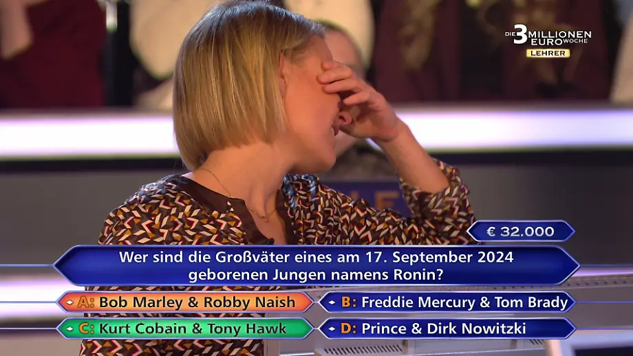 Ihr letzter Joker lockte Spanier leider schnurstracks in Richtung Absturz. Jauch wollte für 32.000 Euro wissen, welche sehr berühmten Großväter ein 2024 geborener Junge namens Ronin hat. Spaniers Telefonjoker tippte auf den Musiker Bob Marley und den Surfer Robby Naish. Seine Aussage "sehr sicher schon" reichten der bei der Frage völlig ahnungslosen Pädagogin, um alles auf eine Karte zu setzen.