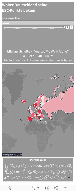 Die Begeisterung für ESC-Beiträge aus Deutschland ist europaweit alles andere als gleichmäßig verteilt. Aus welchen Regionen Europas Deutschland in welchem Jahr wie viele ESC-Punkte bekam, zeigt der Blick auf die folgende Europakarte. Je stärker die Farbe, desto mehr Punkte vergab das jeweilige Land im ausgewählten Jahr an den deutschen Kandidaten.