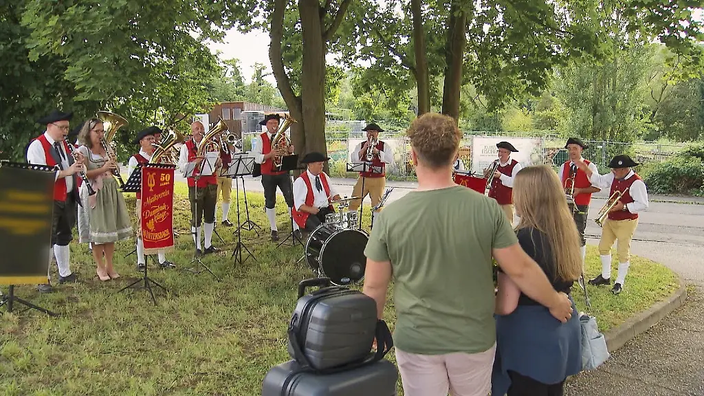 Was bei Mutterkuhhalter Marcel später noch auf den Tisch kommt, ist noch unklar. Allzu vegetarisch wird es in Unterfranken aber wahrscheinlich nicht zugehen: Neben der Mutterkuhhaltung betreibt Marcel auch noch einen Schlachtbetrieb. Bevor es aber diesbezüglich zu Werke geht, steht für Bürokauffrau Jasmin erst einmal ein zünftiger Empfang an. Auf die 30-jährige Hofdame wartet nicht nur ein knallroter Viehtransport-LKW, sondern auch ein komplettes Blasorchester. Die Kapelle schießt auch gleich aus allen Rohren und sorgt für gute Stimmung vor dem Bahnhof: "Das war ein super Empfang!", freut sich Jasmin.