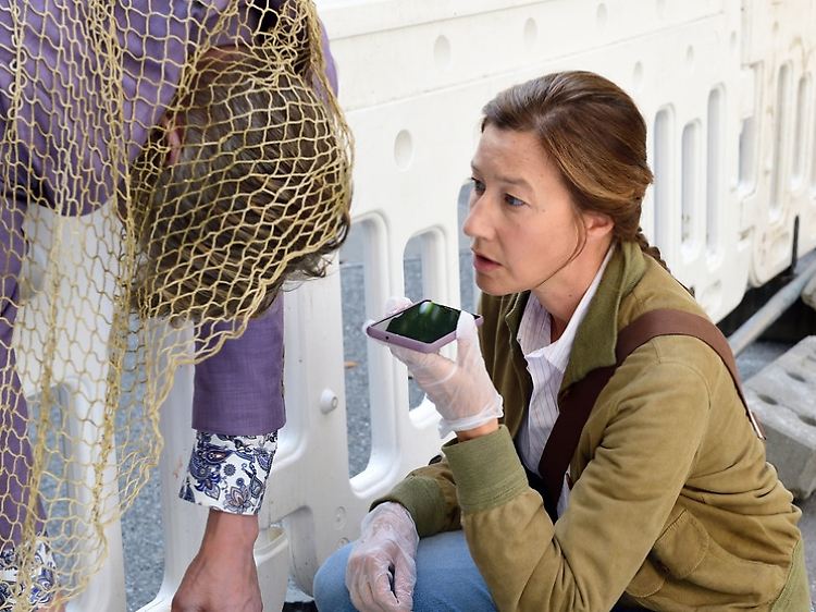 Haben mehr gesehen, als sie den Kommissaren Blohm (Johanna Wokalek) und Eden (Stephan Zinner, ganz rechts) erzählen wollen: Tulip (Patrice Grießmeier, Mitte links), Menora (Božidar Kocevski, Mitte) und Peecabou (Meik van Severen, Mitte rechts).