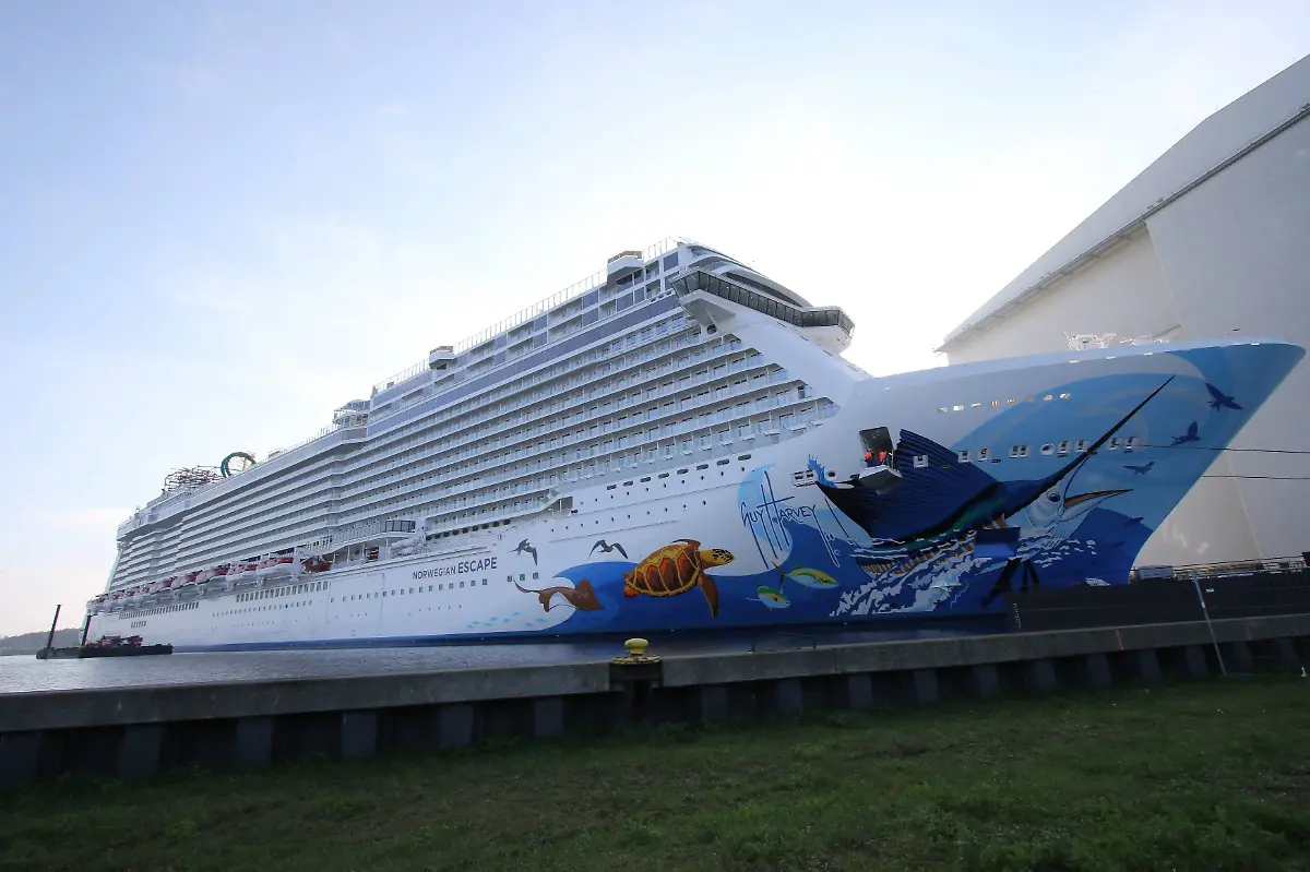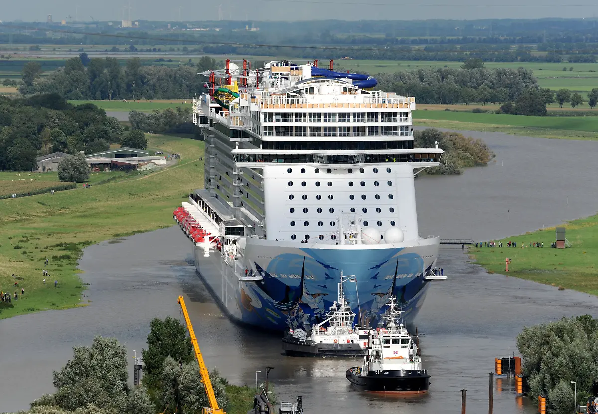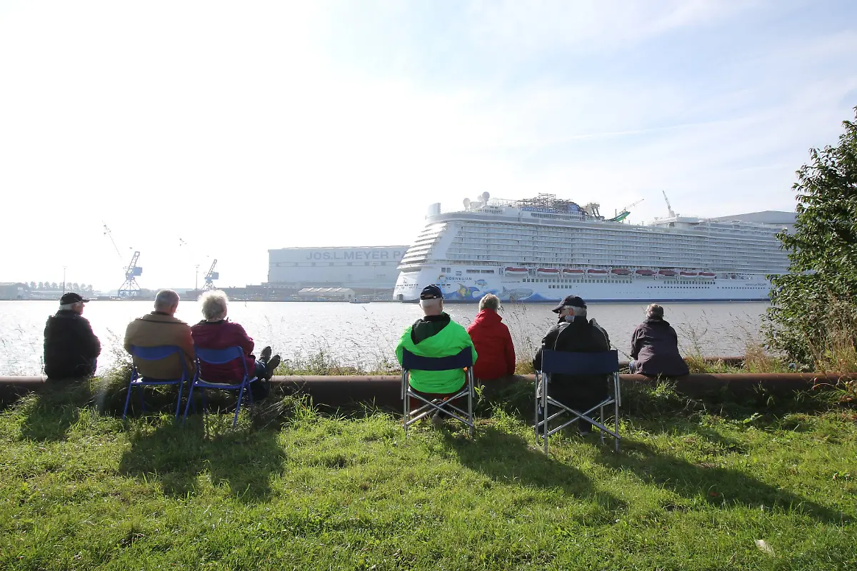 Leicht ist die Reise nicht: Auf der Ems quält sich ein Kreuzfahrtriese voran - auf dem Weg von Papenburg Richtung Nordsee. Den Zuschauern bietet sich ein erstaunlicher Anblick.