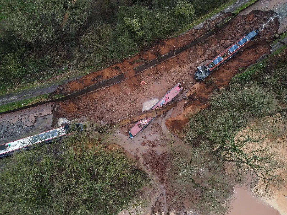 In der britischen Grafschaft Shropshire wachen Anwohner von einem lauten Geräusch auf: Ein Kanalufer ist eingebrochen, das Wasser strömt auf die umliegenden Felder.