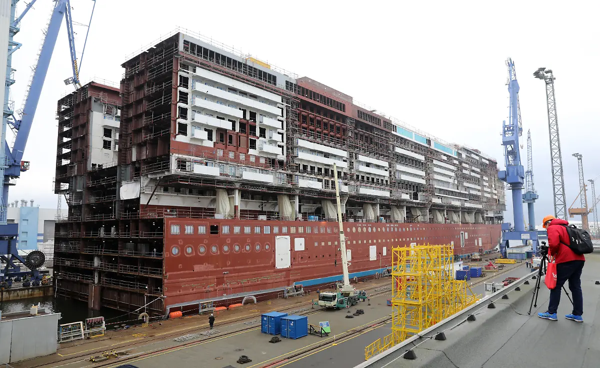 Wenn Kreuzfahrtschiffe gebaut werden, ist alles etwas größer. In den MV Werften in Warnemünde ist ein 216 Meter langes Teilstück der "Global Dream" entstanden, das nun mit Schleppern nach Wismar überführt wird. n-tv.de zeigt die spektakulären Bilder.