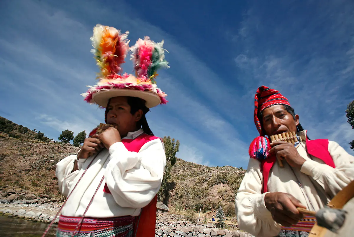 Titicaca-See in SüdamerikaSchwimmende Inseln, strickende Männer