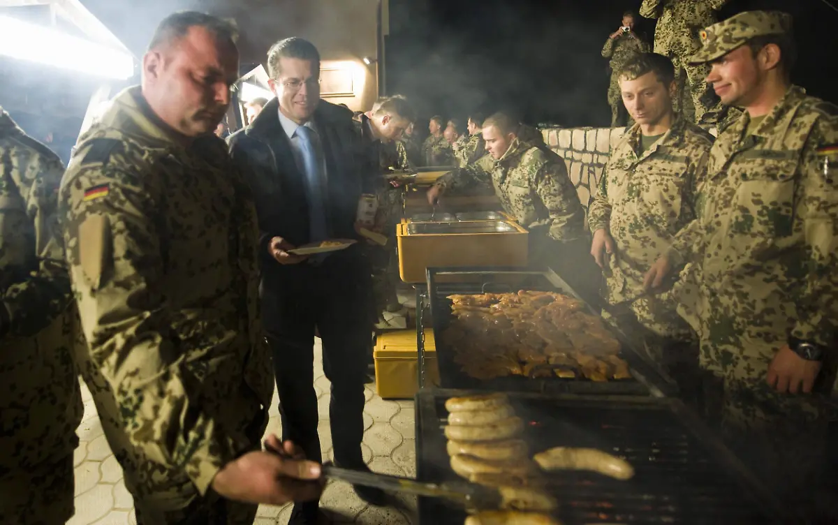 Hunderte Uniformierte drängen sich trotz der nächtlichen Kälte im Innenhof eines Flachbaus im Lager Masar-i-Scharif, wo gewöhnlich Kaffee und Bier ausgeschenkt werden. An diesem Abend gibt es auch Bier, die Attraktion ist diesmal aber: Karl-Theodor zu Guttenberg.Bild 3 von 23 | Foto: dpa