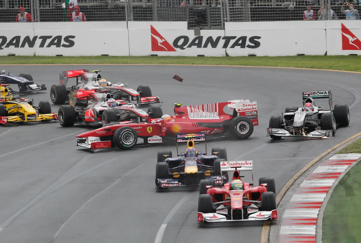 Fernando Alonso wird vom McLaren von Jenson Button in der ersten Kurve berührt und dreht sich. Sein Heck berührt den Frontflügel von Michael Schumacher und beschädigt ihn.Bild 8 von 28 | Foto: REUTERS