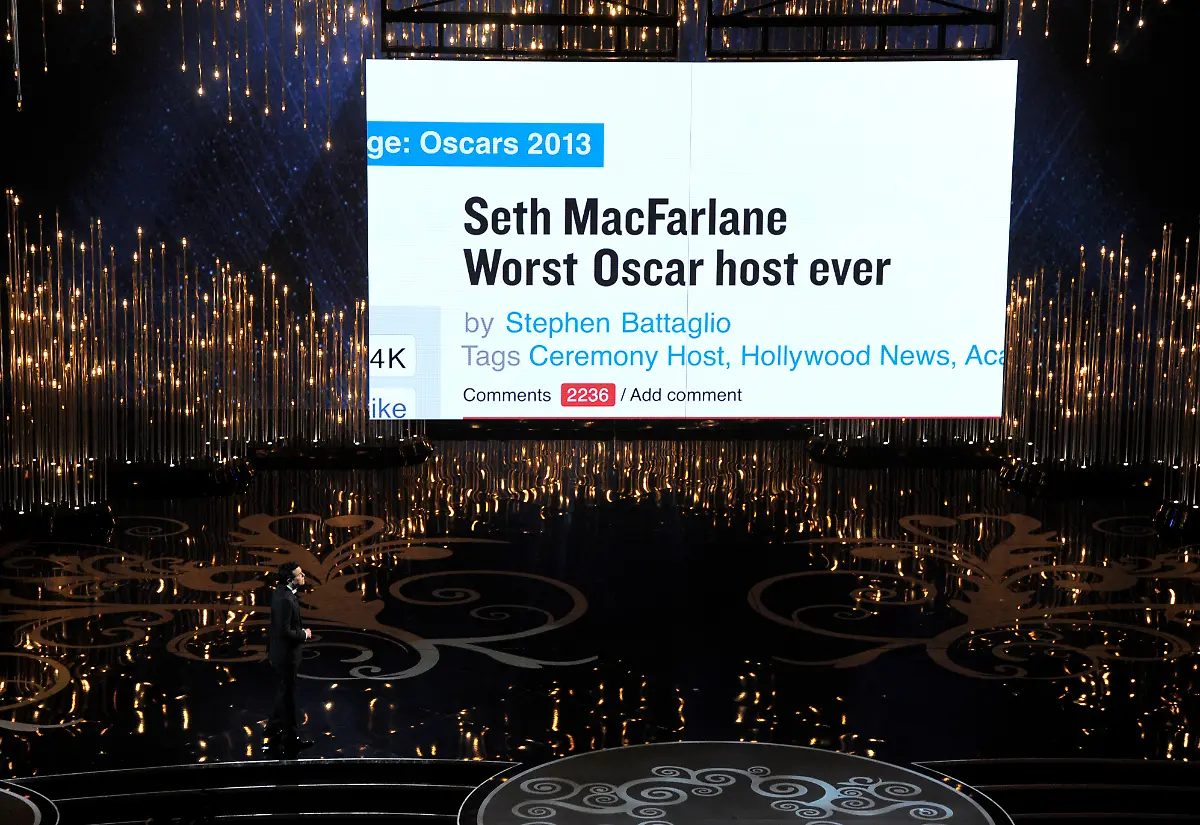 Wir wollen die Frauen sehen wegen ihrer schönen Kleider. Wir wollen die Männer sehen wegen ihres ... ja was, Einheitsanzuges? Sicher nicht, denn sie hatten eine Menge zu bieten bei dieser Oscar-Verleihung: Witz, Tanz und Gesang, thanks to Seth MacFarlane. Und die Frauen? Kann man nicht auf ein Kleid degradieren, sie ertrugen sogar Witze über sich und ihre - uups - Brüste.