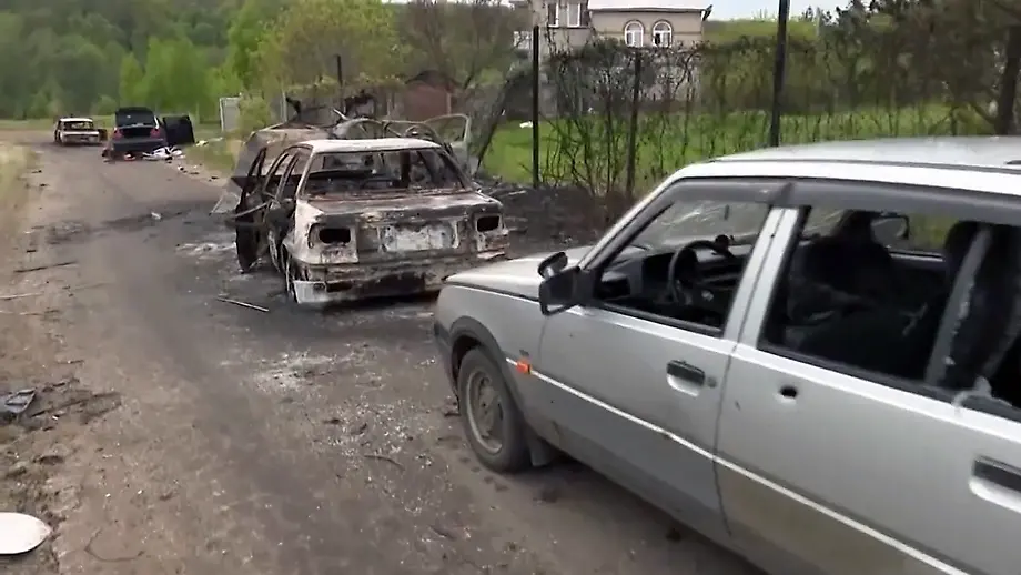Rubishne von Besatzern befreitZerstörte Autos zeugen von russischen Kriegsverbrechen