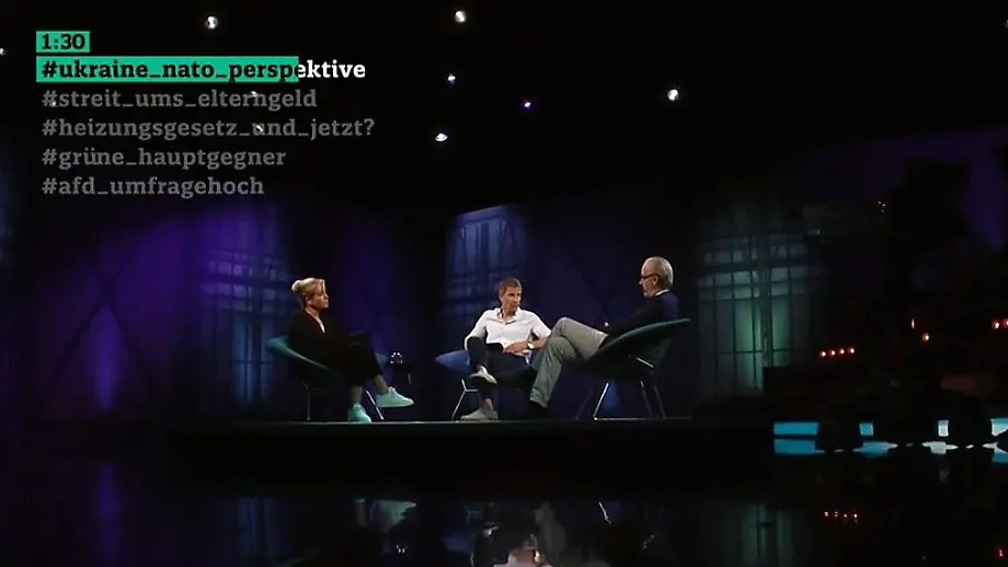 11.07.2023, 15:31 UhrWann erlaubt Erdogan die Ukraine in die NATO, was steckt hinter dem Streit um das Elterngeld und wie lässt sich dem Umfragehoch der AfD beikommen? Diese und weitere aktuelle Themen bespricht Micky Beisenherz mit Mona Neubaur von den Grünen und dem Journalisten Jan Fleischhauer vom "Focus".