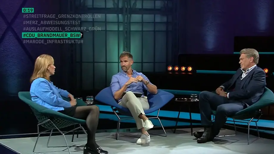 16.09.2024, 21:11 UhrBraucht Deutschland strengere Grenzkontrollen? Können CDU und Grüne in Zukunft koalieren? Und was tun gegen die marode Infrastruktur im Land? Diese und weitere Themen bespricht Micky Beisenherz mit CDU-Politikerin Karin Prien und Journalist Hajo Schumacher.