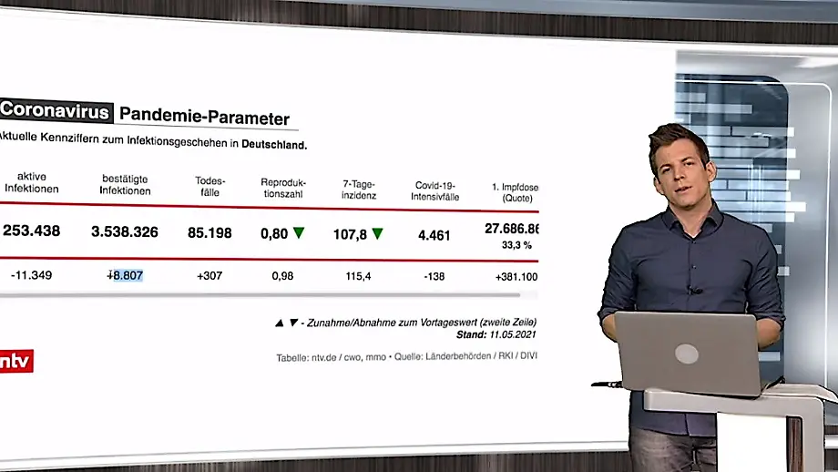 12.05.2021, 11:50 UhrWie hat sich die Zahl der täglichen Neuinfektionen entwickelt? Wie ist die Lage auf den Intensivstationen? Mit aktuellen Fakten zum Infektionsgeschehen ordnet das ntv-Moderatorenteam Daniel Schüler und Katrin Neumann zusammen mit dem SPD-Gesundheitsexperten Karl Lauterbach die Corona-Lage in Deutschland und der Welt ein.