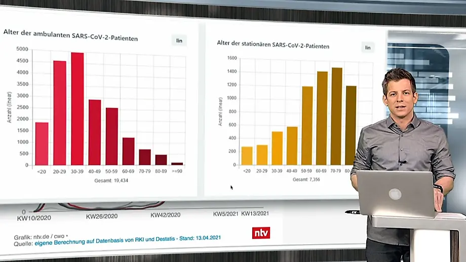 17.04.2021, 08:16 UhrWie hat sich die Zahl der täglichen Neuinfektionen entwickelt? Wie ist die Lage auf den Intensivstationen? Mit aktuellen Fakten zum Infektionsgeschehen ordnet das ntv-Moderatorenteam Daniel Schüler und Doro Steitz zusammen mit Prof. Timo Ulrichs die Corona-Lage in Deutschland und der Welt ein.