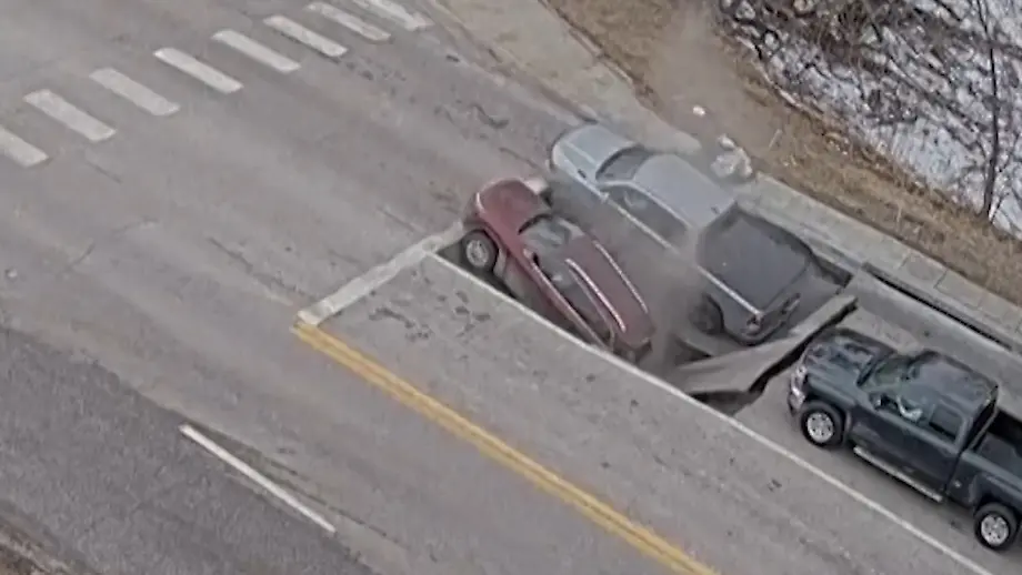 26.02.2026, 06:24 UhrAn einer Kreuzung in Omaha im US-Bundesstaat Nebraska kommt es zu einem Schreckmoment: An einer Ampel gibt der Asphalt plötzlich nach und reißt zwei Autos in die Tiefe. Passanten eilen zur Hilfe. Überwachungskameras halten die Szene fest.