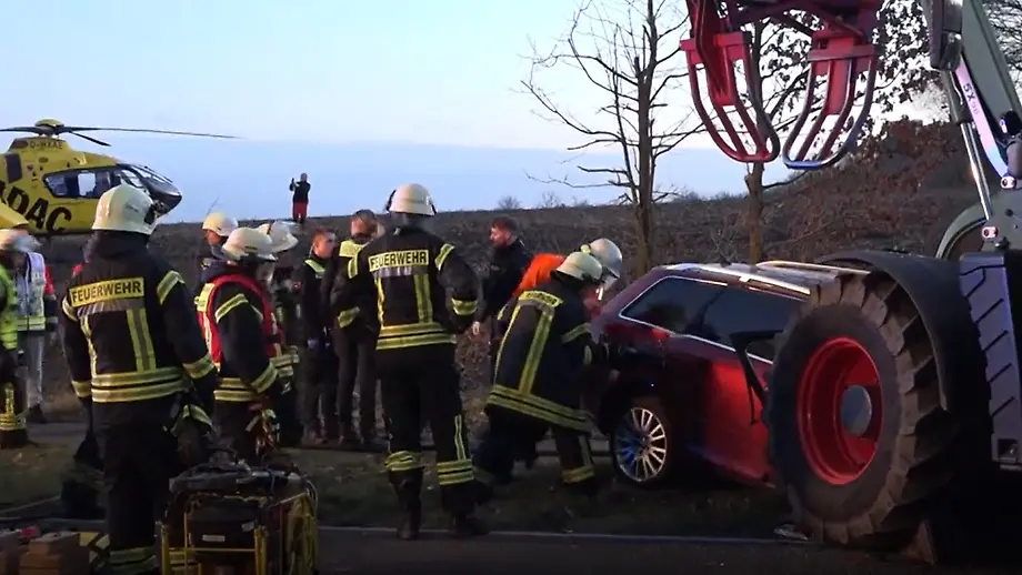 12.03.2025, 13:31 UhrBei einem Unfall im Emsland fährt ein Audi mit drei Personen auf einen Traktor auf und wird in den Gegenverkehr geschleudert. Dort rammt ein weiterer Traktor das Auto und zermalmt es regelrecht. Eine junge Frau stirbt noch an der Unfallstelle, die beiden anderen Personen schweben in Lebensgefahr.
