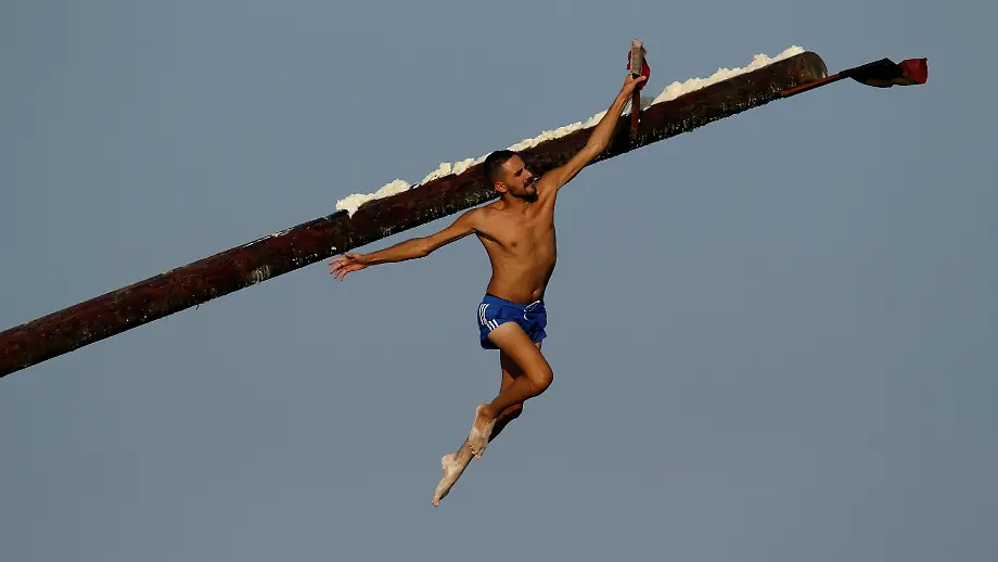 29.08.2017, 18:23 Uhr"Fettbalken-Rennen" ist in Malta Brauch: Die Kandidaten laufen eine eingeschmierte Leiste hoch und versuchen, eine der Fahnen am Ende des Holzes zu ergattern. Meist jedoch rutschen die Läufer auf dem glitschigen Untergrund schon auf dem Weg nach oben aus und plumpsen ins Hafenbecken von Valetta.