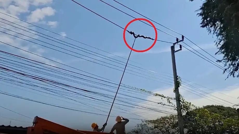 28.02.2025, 16:05 UhrIn Bangkok muss die Elektrizitätsbehörde anrücken, um einen Python von einer Starkstromleitung herunterzuholen. Anwohner entdecken die rund vier Meter lange und 20 Kilogramm schwere Schlange in zehn Metern Höhe. Aus Sorge vor einem Kurzschluss oder Feuer informieren sie die Behörden.