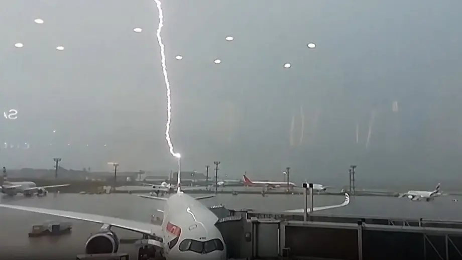 26.01.2025, 14:57 UhrIn Brasilien filmt ein Passagier den Einschlag eines Blitzes in das Leitwerk eines stehenden Flugzeugs, das nach London fliegen soll. Nach einer Inspektion hebt der Airbus A350 der British Airways tatsächlich ab und landet mit sechseinhalb Stunden Verspätung in Heathrow.