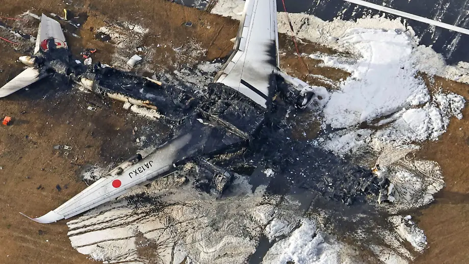 Luftaufnahme nach KollisionBrand-Wracks zeugen von Crash im Flughafen Tokio-Haneda