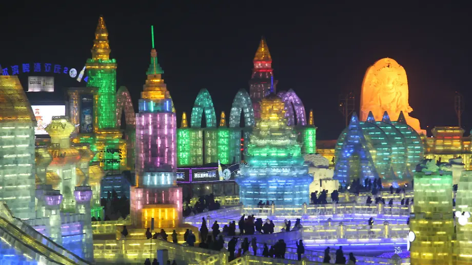 Winterwunderland in ChinaBunte Stadt aus Eis und Schnee erstrahlt in Harbin