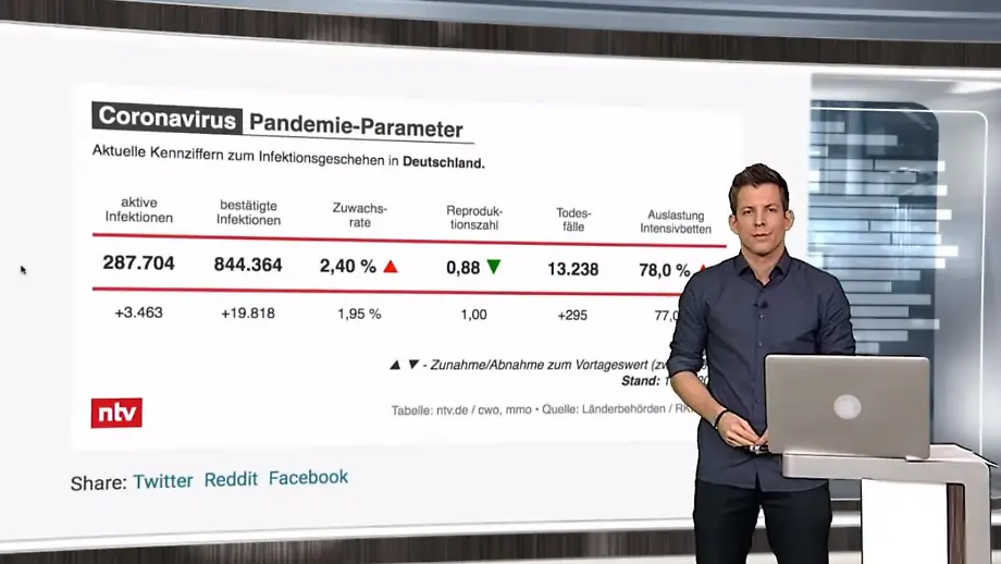 19.11.2020, 12:53 UhrWie hat sich die Zahl der täglichen Neuinfektionen entwickelt? Wo gibt es Infektionsherde? Mit aktuellen Fakten zum Infektionsgeschehen ordnen die ntv-Moderatoren Daniel Schüler und Katrin Neumann zusammen mit dem Epidemiologen Timo Ulrichs die Corona-Lage in Deutschland und der Welt ein.