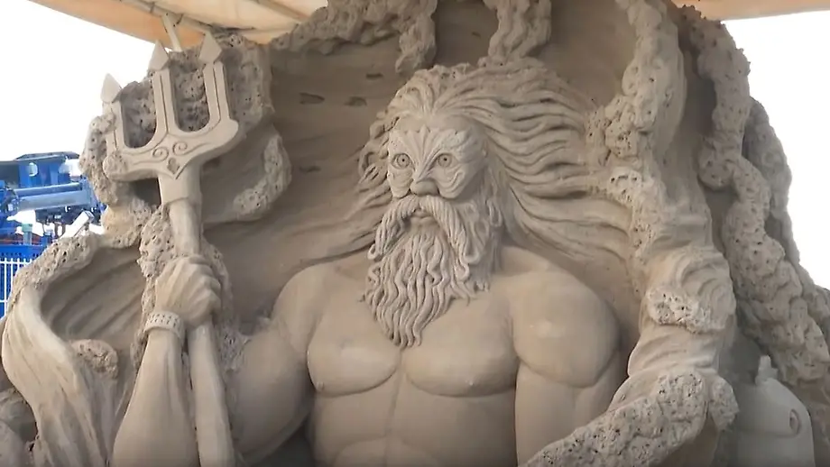 19.04.2025, 12:57 UhrIm Ostseebad Warnemünde stellen Künstler aus sechs Ländern derzeit ihre filigran aus Hunderten Tonnen Sand herausgearbeiteten Skulpturen vor. Passenderweise ist das Motto "Geheimnis der sieben Weltmeere".