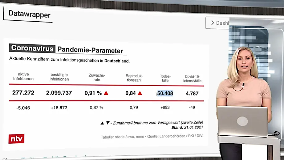 22.01.2021, 12:14 UhrWie hat sich die Zahl der täglichen Neuinfektionen entwickelt? Wie ist die Lage auf den Intensivstationen? Mit aktuellen Fakten zum Infektionsgeschehen ordnen die ntv-Moderatorinnen Anne-Kathrin Cyrus und Katrin Neumann zusammen mit dem Epidemiologen Timo Ulrichs die Corona-Lage in Deutschland und der Welt ein.