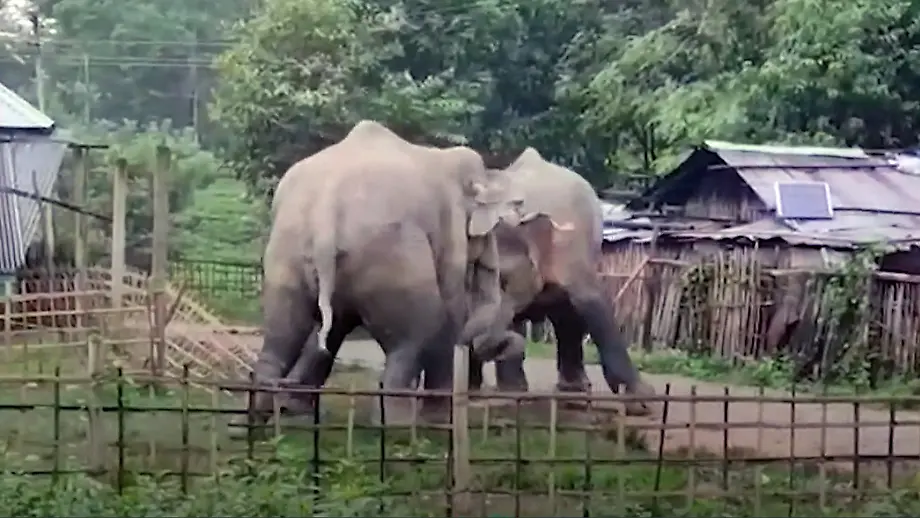Holzhäuser in GefahrDickhäuter-Duell hält indisches Dorf in Atem