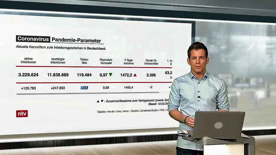 11.02.2022, 11:35 UhrWie hat sich die Zahl der täglichen Neuinfektionen entwickelt? Wie ist die Lage auf den Intensivstationen? Mit aktuellen Fakten zum Infektionsgeschehen ordnet das ntv-Moderatorenteam Daniel Schüler und Vivian Bahlmann zusammen mit dem Epidemiologen Prof. Timo Ulrichs die Corona-Lage in Deutschland und der Welt ein.