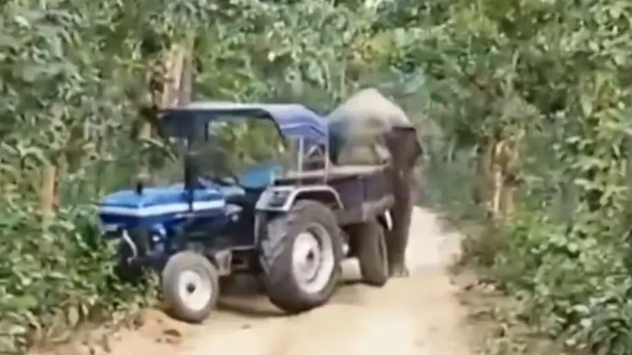 Kaum zu glauben, aber wahrElefant wuchtet Traktor samt Anhänger von der Straße