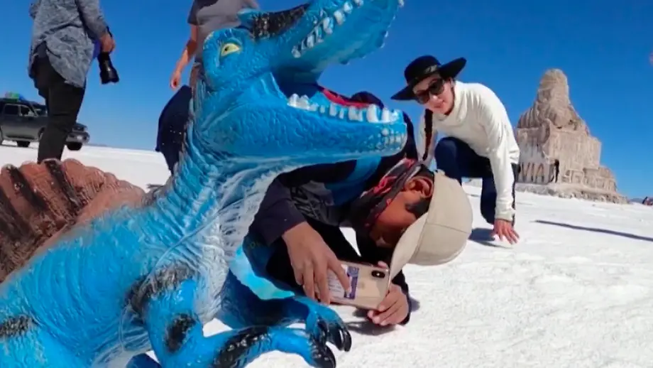 01.05.2022, 12:05 UhrMit einem Dinosaurier aus Plastik und seiner Kamera ist Piter Condori ein kleiner Star in der bolivianischen Salzwüste Salar de Uyuni. Dort fotografiert der Elfjährige Touristinnen und Touristen auf kreative Weise. Mit den Bildern bessert der Junge auch das Familieneinkommen auf.