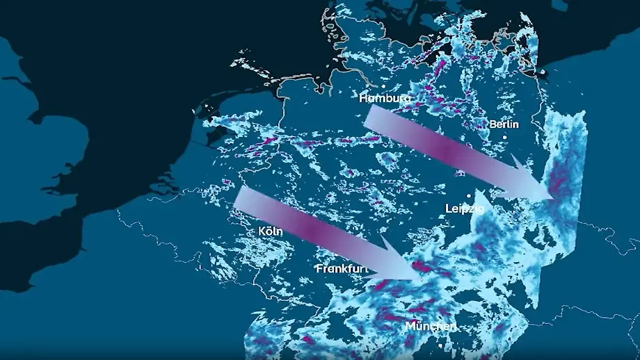 28.05.2025, 14:24 UhrEine dicke Gewitterfront rollt über Deutschland, hat Platzregen, Hagel und Sturmböen im Gepäck. Pünktlich zum Feiertag wird das Wetter dann deutlich freundlicher, bevor sich Richtung Wochenende sommerliche Temperaturen einstellen. Im Süden sind dann an die 30 Grad möglich.