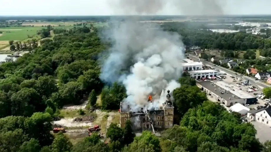 Rauch kilometerweit sichtbarFeuer frisst sich durch historisches Schloss in Polen