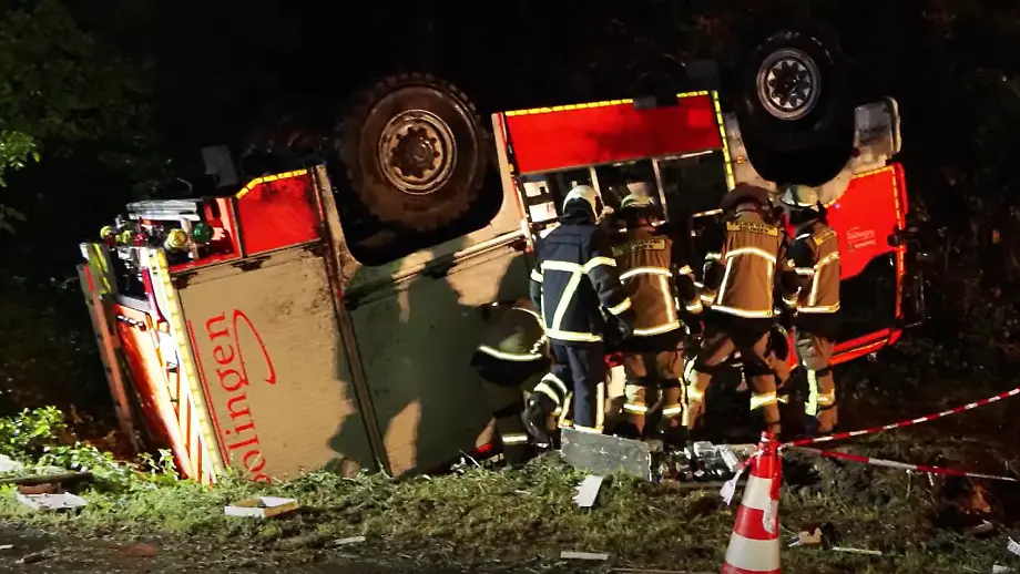 Drei verletzte RettungskräfteFeuerwehrfahrzeug überschlägt sich bei Einsatz in Haan