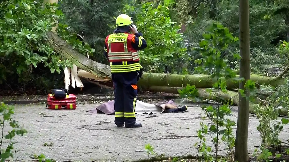 05.07.2023, 18:03 UhrDas Tiefdruckgebiet "Poly" zieht über Deutschland hinweg, und die aktuell dicht belaubten Bäume bieten für die Orkanböen große Angriffsflächen. Eine Frau in Rhede verliert so ihr Leben. Auch in den kommenden Tagen bleibt es in betroffenen Wäldern lebensgefährlich.