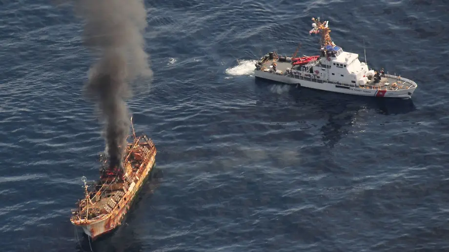 Von Küstenwache in Brand geschossenGeisterschiff versinkt im Meer