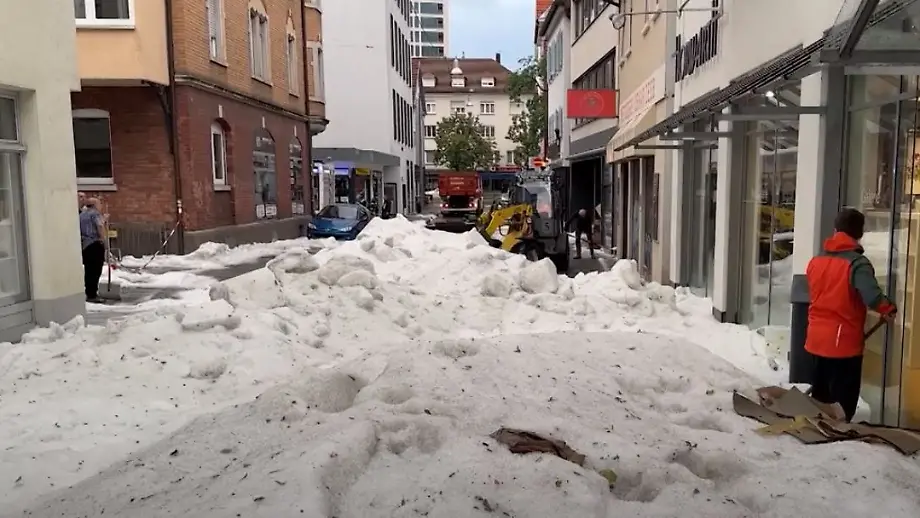 05.08.2023, 09:29 UhrWinterdienst-Einsatz mitten im Sommer: Ein lokal begrenztes Unwetter überzieht Straßen in der Innenstadt von Reutlingen in Baden-Württemberg mit einer 30 Zentimeter hohen Hagelschicht. Schneepflüge müssen anrücken, um die Straßen freizuräumen.