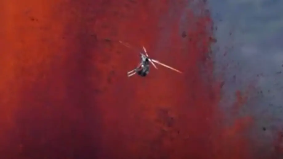 Spektakuläre optische TäuschungHelikopter fliegt scheinbar direkt vor riesiger Lava-Wand