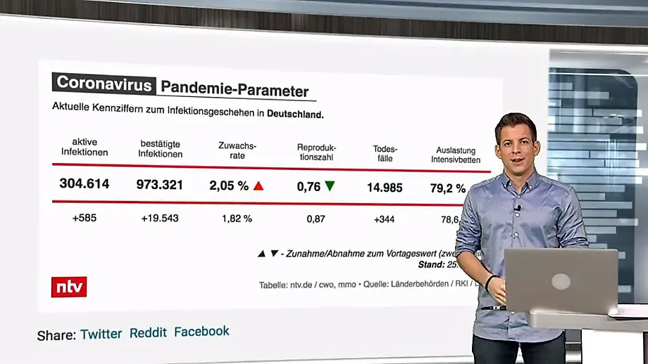 26.11.2020, 12:46 UhrWie hat sich die Zahl der täglichen Neuinfektionen entwickelt? Wo gibt es Infektionsherde? Mit aktuellen Fakten zum Infektionsgeschehen ordnen die ntv-Moderatoren Daniel Schüler und Nina Lammers zusammen mit dem Epidemiologen Prof. Timo Ulrichs die Corona-Lage in Deutschland und der Welt ein.