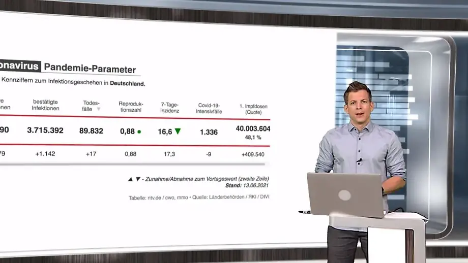 14.06.2021, 12:50 UhrWie hat sich die Zahl der täglichen Neuinfektionen entwickelt? Wie ist die Lage auf den Intensivstationen? Mit aktuellen Fakten zum Infektionsgeschehen ordnen das ntv-Moderatorenteam Daniel Schüler und Doro Steitz zusammen mit dem Betriebsärzte-Vorsitzenden Dr. Uwe Gerecke die Corona-Lage in Deutschland und der Welt ein.