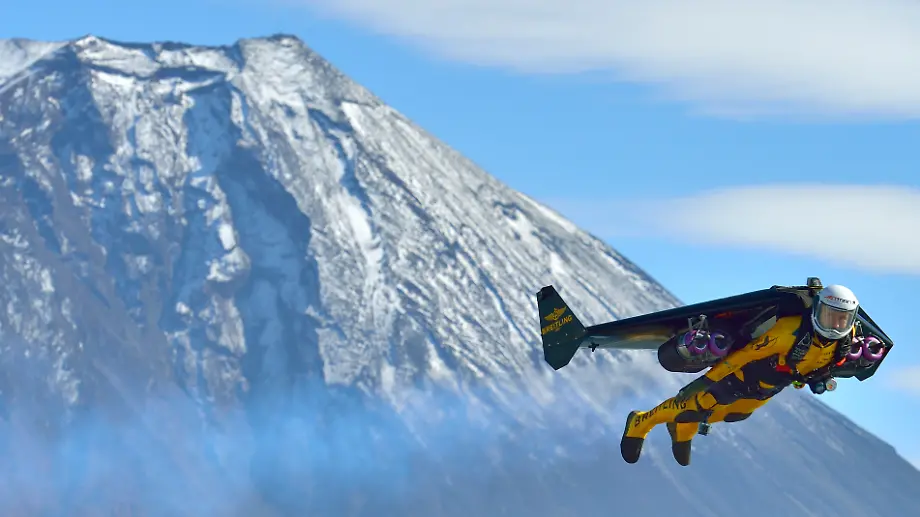 "Kleiner Moskito vor großem Berg""Jetman" fliegt mit bis zu 300 km/h um Fuji