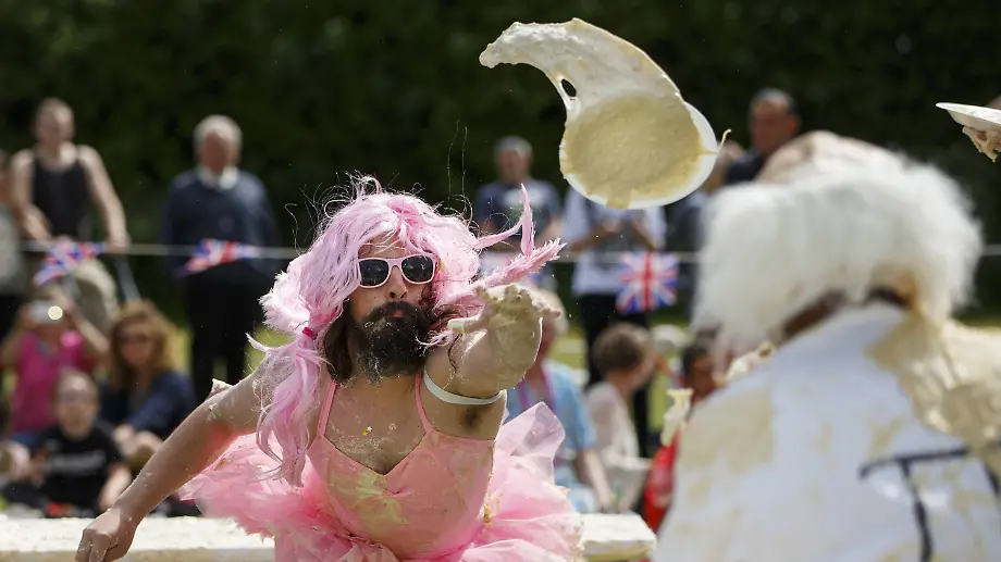 06.06.2016, 16:23 UhrJa, England ist bekannt für skurrile Wettbewerbe. Das beweist die Insel nun erneut in der Stadt Coxheath. Dort bewerfen sich Teilnehmer eines Tortenschlacht-Wettkampfs gegenseitig mit Sahnebomben - natürlich in verrückten Kostümen.