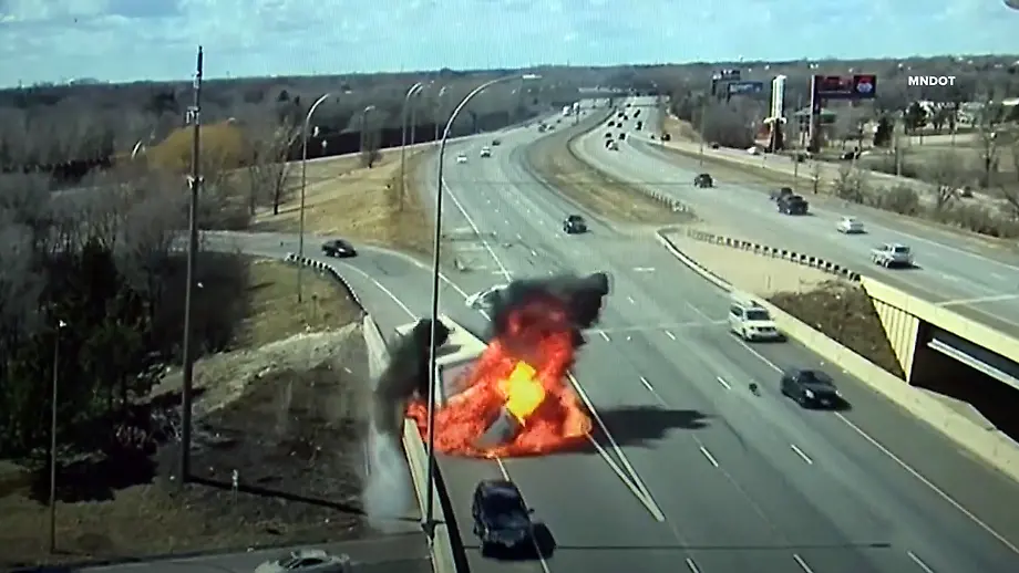 12.04.2022, 14:37 UhrIm US-Bundesstaat Minnesota hält eine Überwachungskamera einen schweren Lkw-Unfall fest, bei dem das Fahrzeug beinahe von der Brücke stürzt und die Fahrerkabine kurzzeitig in einem Feuerball verschwindet. Wie durch ein Wunder kommt bei dem Vorfall niemand ernsthaft zu Schaden.