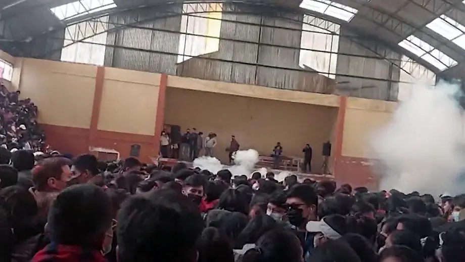 10.05.2022, 15:01 UhrIn Bolivien sind in einer Massenpanik während einer Universitätsversammlung vier Menschen zu Tode gekommen, Dutzende werden verletzt. Grund ist eine Tränengasgranate, deren Zündung eine Explosion auslöst.