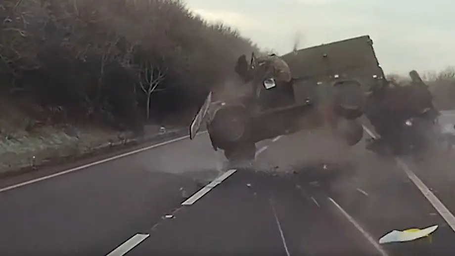 Heftiger Unfall in EnglandMilitärjeep überschlägt sich - Fahrer fliegt aus dem Auto