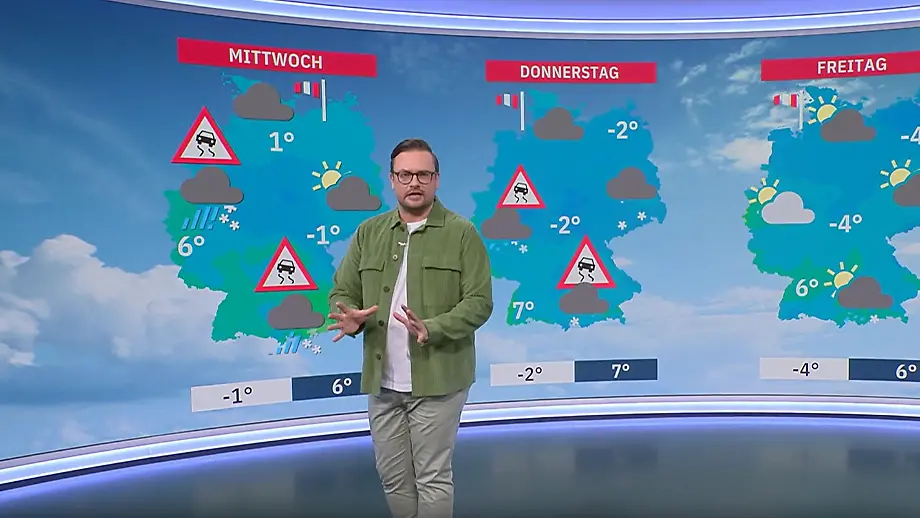 Heute wird es insgesamt trockener als in den Vortagen, doch milde Luft aus dem Westen bringt auch wieder neues Blitzeis. Vor allem im Südwesten des Landes gilt: Vorsicht auf den Straßen. Auch die nächsten Tage bleibt es rutschig.